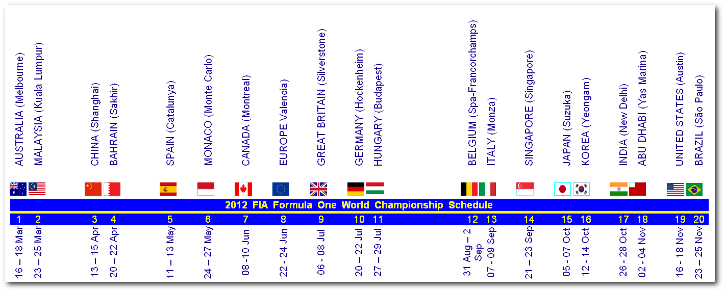 […] Autralian Grand Prix – Melbourne – Albert Park (First Race Formula 1 2012 season) March 19, 2012 Formula 1 – 2012 Grand Prix No comments Este oficial! A început noul sezon de Formula 1. Și cum altfel decât în stil mare. Va fi un sezon incendiar. De ce? În ce an ați mai văzut 6 campioni mondiali cu 14 titluri. Schimbări multe de regulament, pneuri diferite, piloți noi și vechi. Cum vin treburile de fapt? Păi după o simplă adunare avem așa: 2 titluri Alonso + 2 titluri Vettel + un titlu Rainkkonen + un titlu Hamilton + un titlu Button = 7 titluri Schumacher. Rezultatul îl vom vedea la sfârșitul sezonului – unul destul de lung 20 curse. […]