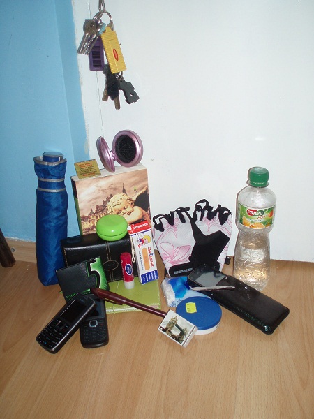 Acum să vedem ce avem: una bucată umbrelă pentru zile cu soare cu dinți, una bucată sticlă de apă pentru că sunt mai setilă, chibrit – alteori avem brichetă (fumez ocazional dar nu ai de unde ști când ai nevoie de un foc), 3 bucăți telefoane Nokia, o mică agendă, plasturi pentru că mai mereu am nevoie de unul, strugurel de buze, portofel, perie de păr – care odată a avut și oglindă, nu puteau lipsi gumele mele favorite – 5Five, crema Norvea sau alteori Nivea, un stilou, mai mereu am o carte, iar pentru când mă plictisesc de carte am un Yo-Yo, zgarda de chei la care apare câte un breloc și devine din ce în ce mai mare, șervețele uscate și umede (acum am rămas fără), o pensetă și mai nou niște mânuși de sport/bicicletă – mai ales că a venit sezonul perfect pentru o mică plimbare.